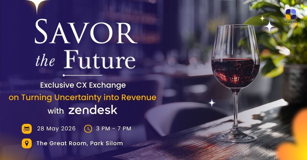Navigate the Shift. Drive the Revenue. จุดประกายกลยุทธ์ CX ที่ใช่ ผ่านบทสนทนาที่ล้ำลึกและรสสัมผัสของไวน์สุดพรีเมียม ท่ามกลางสภาวะตลาดที่แปรปรวน การรักษาฐานลูกค้าและการขยายขีดความสามารถทางธุรกิจกลายเป็นโจทย์ที่ท้าทายยิ่งกว่าเดิม Demeter ICT และ Zendesk ขอเชิญคุณร่วมเป็น 1 ใน 30 ผู้บริหารที่จะมาเจาะลึกแนวทางเปลี่ยนงานบริการให้เป็นผลกำไร ผ่านเซสชันบรรยายและประสบการณ์จริงจากคนวงในที่หาอ่านไม่ได้จากที่ไหน Event Highlights: The Scaling Blueprint: ถอดรหัสการสเกลธุรกิจ พลิกบทบาทงานบริการสู่กลไกสร้างรายได้ โดยไม่เพิ่มต้นทุนการดำเนินงาน Behind the Transformation: เจาะลึกเบื้องหลังการทรานส์ฟอร์มธุรกิจผ่านประสบการณ์จริงจากองค์กรชั้นนำ พร้อมเผยวิธีใช้ Zendesk ปลดล็อกข้อจำกัดและยกระดับ CX ให้พร้อมรับทุกการเปลี่ยนแปลง The CX Exchange: ร่วมวงสนทนากับผู้นำในแวดวง CX วิเคราะห์ปัญหาธุรกิจท่ามกลางความผันผวนของตลาดไทยและระดับโลก พร้อมแบ่งปันไอเดียแก้ปัญหาและกลยุทธ์ที่เห็นผลจริง Wine & Wisdom Networking: ต่อยอดคอนเนกชันในบรรยากาศผ่อนคลาย พร้อมรับคำปรึกษาเชิงลึกจากทีมผู้เชี่ยวชาญ Demeter ICT อย่างเป็นกันเอง ร่วมถกปัญหาที่คุณเผชิญ ค้นพบทางลัดจากประสบการณ์จริงของเพื่อนร่วมวงการ และก้าวออกไปพร้อมกลยุทธ์ที่สร้างการเติบโตอย่างยั่งยืนไปกับเรา ลงทะเบียนเข้าร่วมงาน *งานอีเวนต์ฟรีไม่มีค่าใช้จ่าย เอกสิทธิ์เฉพาะผู้ที่ได้รับเชิญเท่านั้น (จำกัดเพียง 30 ที่นั่ง) Agenda 15.00 – 15.30 น. Registration 15.30 – 15.40 น. Welcome Speech 15.40 – 16.00 น. The Scaling Blueprint: From Cost Center to Revenue Engine กลยุทธ์พลิกบทบาทงานบริการจากภาระค่าใช้จ่ายสู่ ‘กลไกสร้างรายได้’ ที่รุกเข้าหาโอกาสและรักษาฐานลูกค้า สำรวจแนวทางการสเกลธุรกิจให้เติบโตอย่างไร้ขีดจำกัด โดยไม่ต้องเพิ่มต้นทุนท่ามกลางเศรษฐกิจที่ผันผวน 16.00 – 16.30 น. Behind...