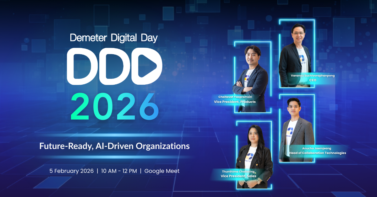 ลงทะเบียนรับสิทธิ์เข้าร่วม ปี 2026 โลกธุรกิจกำลังก้าวเข้าสู่ช่วงเปลี่ยนผ่านที่เร็วและชัดเจนกว่าที่เคยทั้งเทคโนโลยีที่พัฒนาอย่างก้าวกระโดด พฤติกรรมผู้บริโภคที่เปลี่ยนตลอดเวลารวมถึงแนวคิดการทำงานรูปแบบใหม่ที่ยืดหยุ่นมากขึ้น ผนวกด้วย AI ที่ปีนี้ไม่ได้เป็นแค่เครื่องมือเสริม แต่เริ่มมีบทบาทกับทุกการตัดสินใจขององค์กร โดยคำถามสำคัญที่ผู้นำองค์กรต้องตระหนักจึงไม่ใช่แค่ว่า “เราพร้อมหรือยัง?” แต่คือ “เครื่องมือ ระบบ และวิธีทำงานที่เราใช้อยู่ในวันนี้ยังจะพาองค์กรไปต่อได้จริงในอีก 2 ปีข้างหน้าหรือไม่?” Demeter ICT ขอเชิญชวนผู้บริหาร ผู้นำทีม และพนักงานปฏิบัติการ รวมถึงองค์กรที่กำลังเริ่มต้น หรืออยู่ระหว่างการปรับเปลี่ยนรูปแบบการทำงาน ที่ต้องการเข้าใจทิศทางและความเปลี่ยนแปลงที่กำลังเกิดขึ้นจริงของอนาคตอันใกล้นี้ มาร่วมมองภาพการเปลี่ยนผ่านขององค์กรอย่างเป็นระบบว่าควรปรับตรงไหนก่อน อะไรควรทำทันที และอะไรควรรอ เพื่อเชื่อมโยงไปสู่การนำไปใช้งานได้อย่างเป็นรูปธรรม ตั้งแต่การปรับกระบวนการทำงานภายในองค์กร การนำเทคโนโลยีและ AI มาเสริมประสิทธิภาพการทำงาน การยกระดับการบริการลูกค้า ไปจนถึงการวางรากฐานเพื่อการเติบโตของธุรกิจในระยะยาว งานนี้เข้าร่วมฟรี ! โอกาสครั้งเดียวที่จะเข้าใจการเปลี่ยนแปลงและปรับองค์กรให้พร้อมปี 2026! แบบครบจบทุกมุมมองธุรกิจ Demeter Digital Day 2026: Future-Ready, AI-Driven Organizations พฤหัสบดีที่ 5 กุมภาพันธ์ 2569 10:00 – 12:00 น.Google Meet (Online) ลงทะเบียนรับสิทธิ์เข้าร่วม หลังจากลงทะเบียนรับสิทธิ์เข้าร่วม โปรดรอ Confirmation Email Days Hours Minutes Seconds...