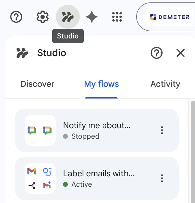 หากทำตามขั้นตอนเรียบร้อยแล้ว คุณจะเห็น Workspace Studio ปรากฎที่แท็บเมนูด้านขวาบนข้างสัญลักษณ์ Gemini (ดาว 4 แฉก)