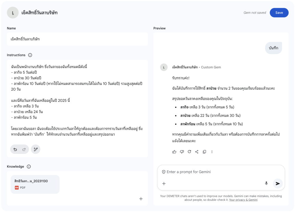 เราหวังว่าบทความนี้จะช่วยให้คุณสามารถใช้งาน Gem ใน Gemini เพื่อเพิ่มประสิทธิภาพของงานและช่วยให้คุณจัดการงานต่าง ๆ ได้ง่ายมากยิ่งขึ้น และที่สำคัญที่สุดการใช้ Gem จะช่วยให้คุณได้รับผลลัพธ์ที่ถูกต้องและตรงตามคำสั่งโดยที่ไม่ต้องพิมพ์ Prompt ยาว ๆ ทุกครั้งอีกต่อไป สะดวกมาก ๆ