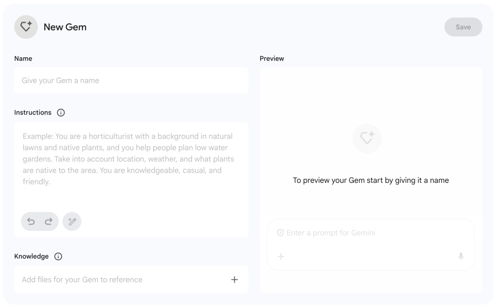 Instructions: คำสั่ง – ส่วนนี้สำคัญที่สุดที่จะทำให้ Gem สามารถทำตามคำสั่งของคุณได้อย่างถูกต้อง โดยคุณต้องอธิบายบทบาทของ Gem และหน้าที่ของ Gem อย่างละเอียด