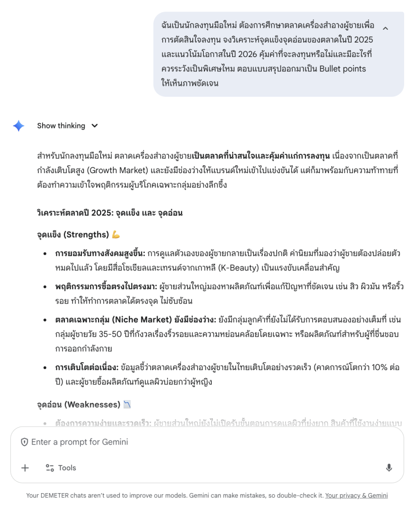 ตัวอย่าง Prompt ที่มีการใช้โมเดล Pro เพื่อผลลัพธ์ที่แม่นยำมากขึ้น “ฉันเป็นนักลงทุนมือใหม่ ต้องการศึกษาตลาดเครื่องสำอางผู้ชายเพื่อการตัดสินใจลงทุน จงวิเคราะห์จุดแข็งจุดอ่อนของตลาดในปี 2025 และแนวโน้มโอกาสในปี 2026 คุ้มค่าที่จะลงทุนหรือไม่และมีอะไรที่ควรระวังเป็นพิเศษไหม ตอบแบบสรุปออกมาเป็น Bullet points ให้เห็นภาพชัดเจน“
