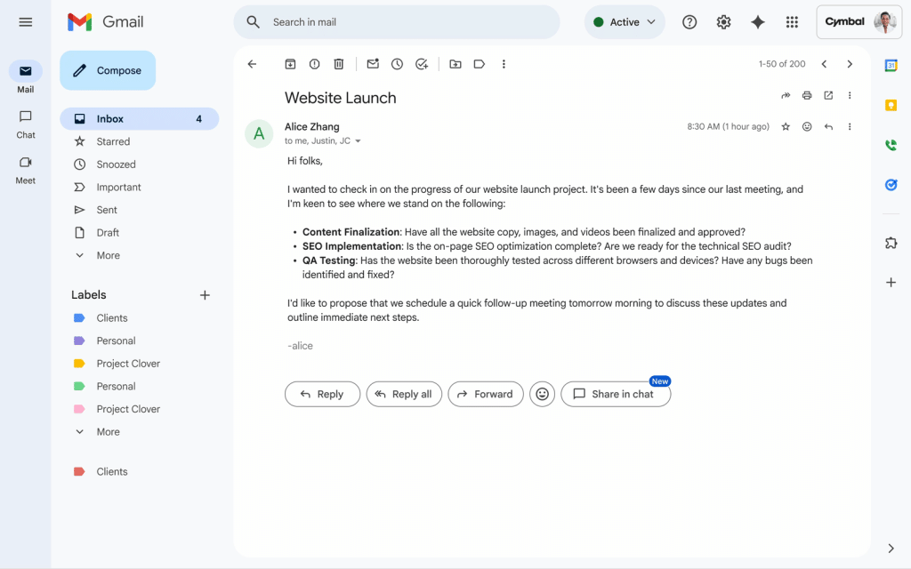 Google ประกาศเปิดตัวฟีเจอร์ใหม่ใน Gmail ที่เชื่อมต่อการทำงานเข้ากับ Google Chat ให้สามารถแชร์เมลใน Inbox ไปยังแชทส่วนตัว (Direct message) หรือแบบกลุ่ม (Chat space) ได้อย่างง่ายดาย ซึ่งผู้ที่ได้รับการแชร์จะสามารถเปิดอ่านเมลผ่านลิ้งก์ในแชทได้เลย โดยที่ไม่ต้องสลับแท็ปไปมาระหว่าง Gmail และ Google Chat ทำให้ทุกคนเห็นข้อมูลเดียวกัน และเข้าใจบริบทตรงกันตั้งแต่เริ่มต้น