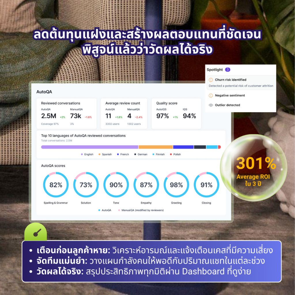 ระบบ QA ที่ขับเคลื่อนด้วย AI ช่วยตรวจจับความเสี่ยงและสัญญาณของลูกค้าที่จะเลิกใช้บริการ (Churn) ได้ล่วงหน้า ก่อนที่สถานการณ์จะบานปลาย