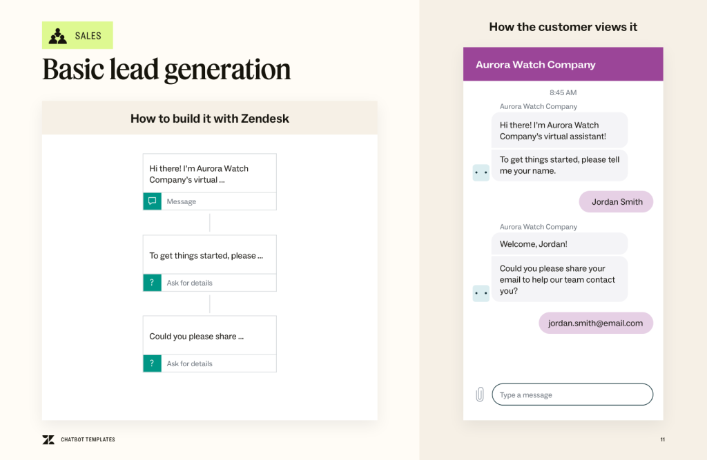 此模板可自动收集潜在客户信息,而无需占用销售团队时间。例如,你可以设置聊天机器人询问访客的姓名和邮箱,并将信息有效传递给销售团队跟进。