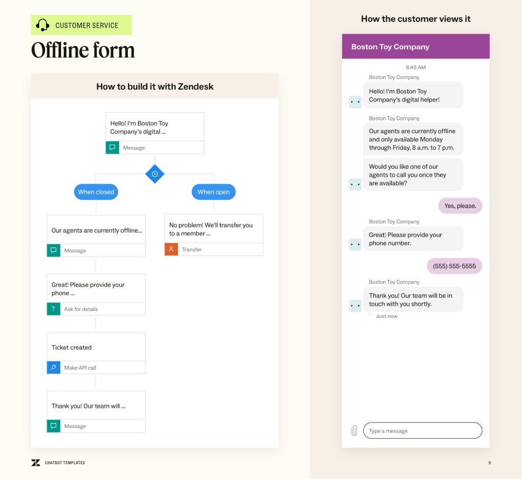 虽然聊天机器人可以 24/7 全天候工作,但有时客户仍希望直接与人工客服交流。此模板可在无客服时收集关键信息,并在客服上线后转交给团队。